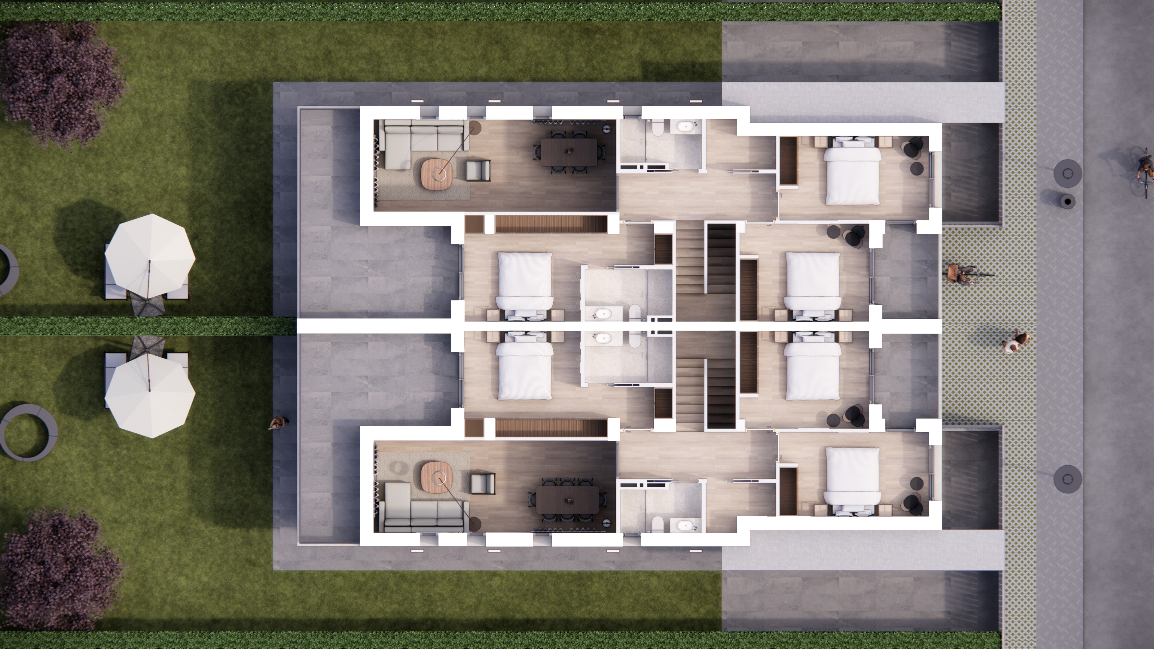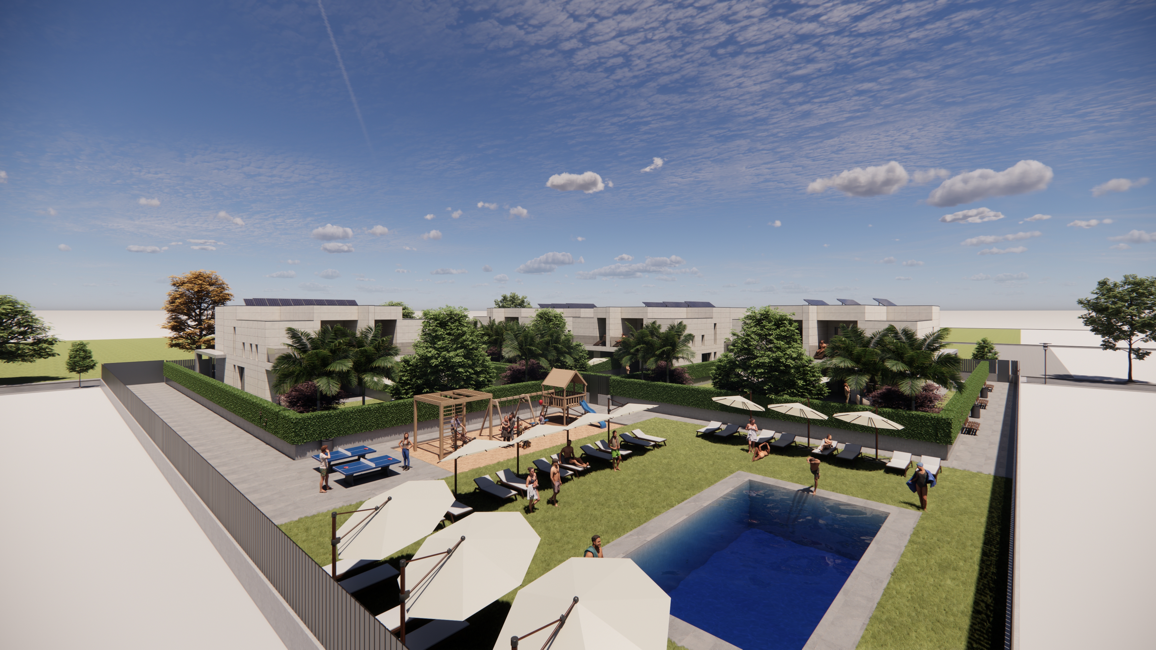 8 viviendas unifamiliares pareadas dispuestas en baja+1 de 150m² útiles en parcelas de 375m² cada una, 4 dormitorios, 3 baños, garaje cubierto, espacio ajardinado privado + espacio comunitario con parque infantil + piscina.