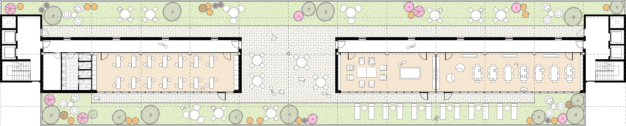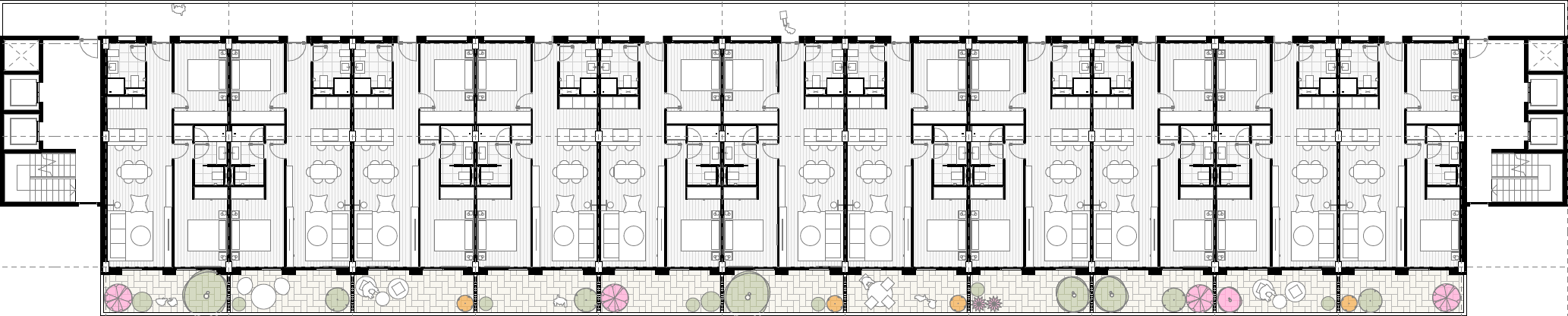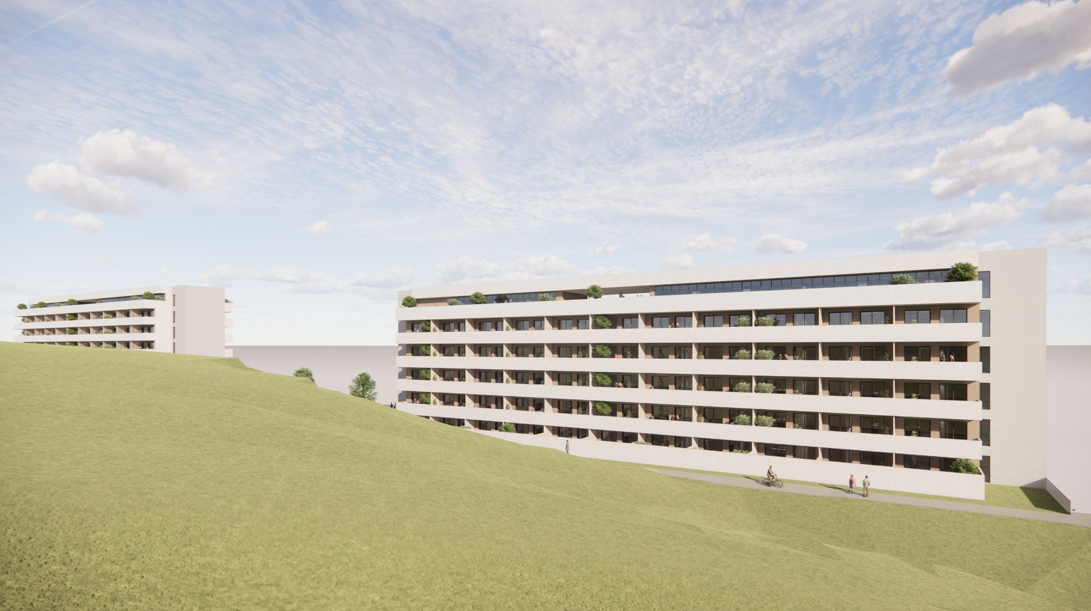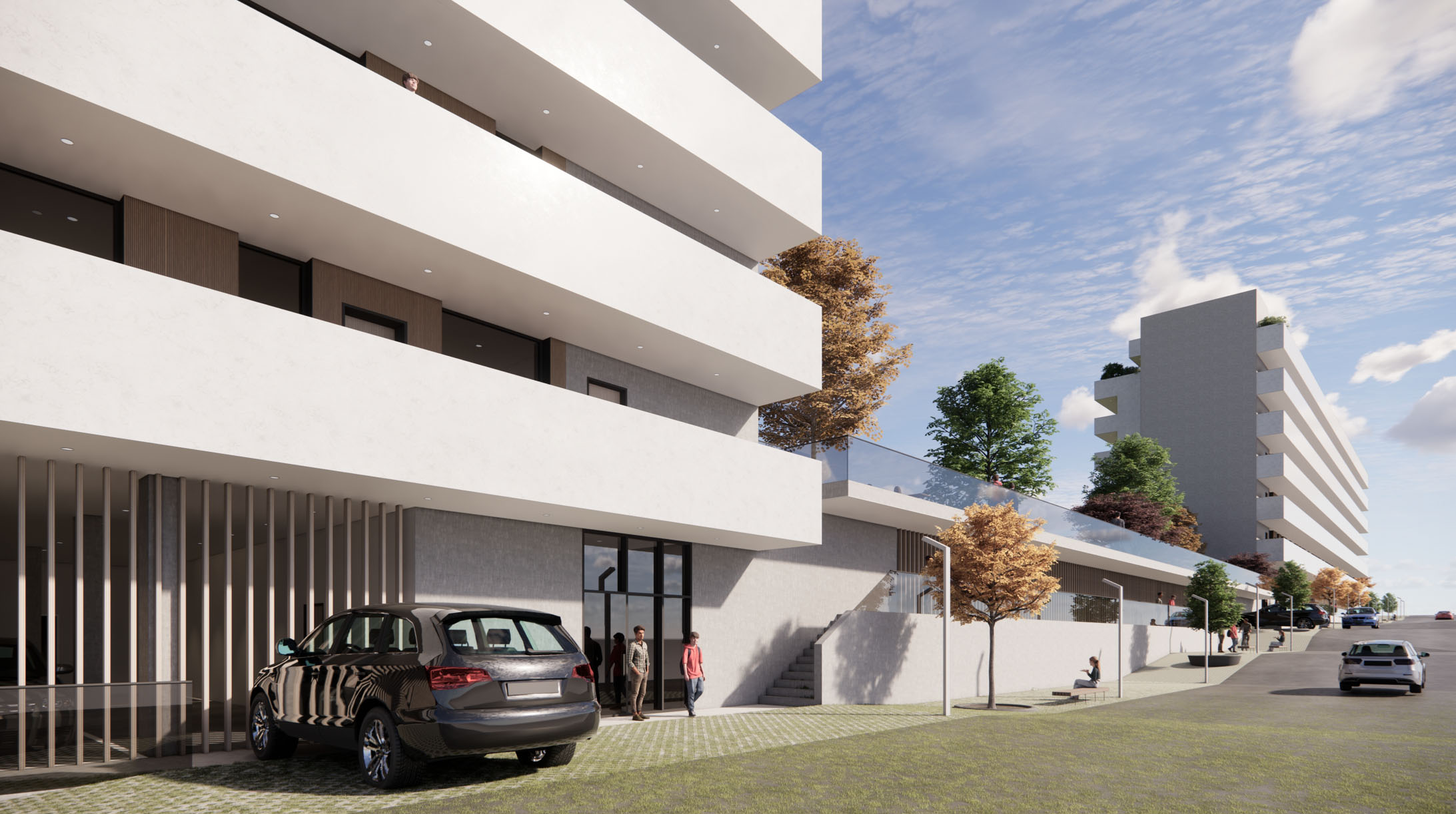 110 viviendas sociales en bloque en baja+4. La planta baja consta de una zona común destinada a gimnasio, cuarto de bicicletas y zona de coworking. Cada planta esta compuesta por módulos de viviendas de 2 dormitorios, 2 baños y cocina/salón/comedor abierto con terraza exterior. A las viviendas se acceden mediante un pasillo exterior. La planta cubierta se destina a espacio de ocio y terraza al exterior común.