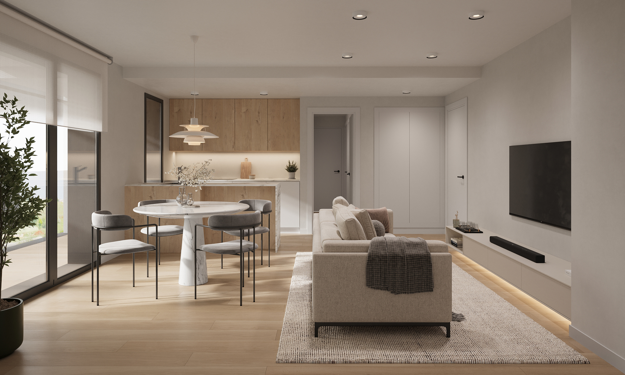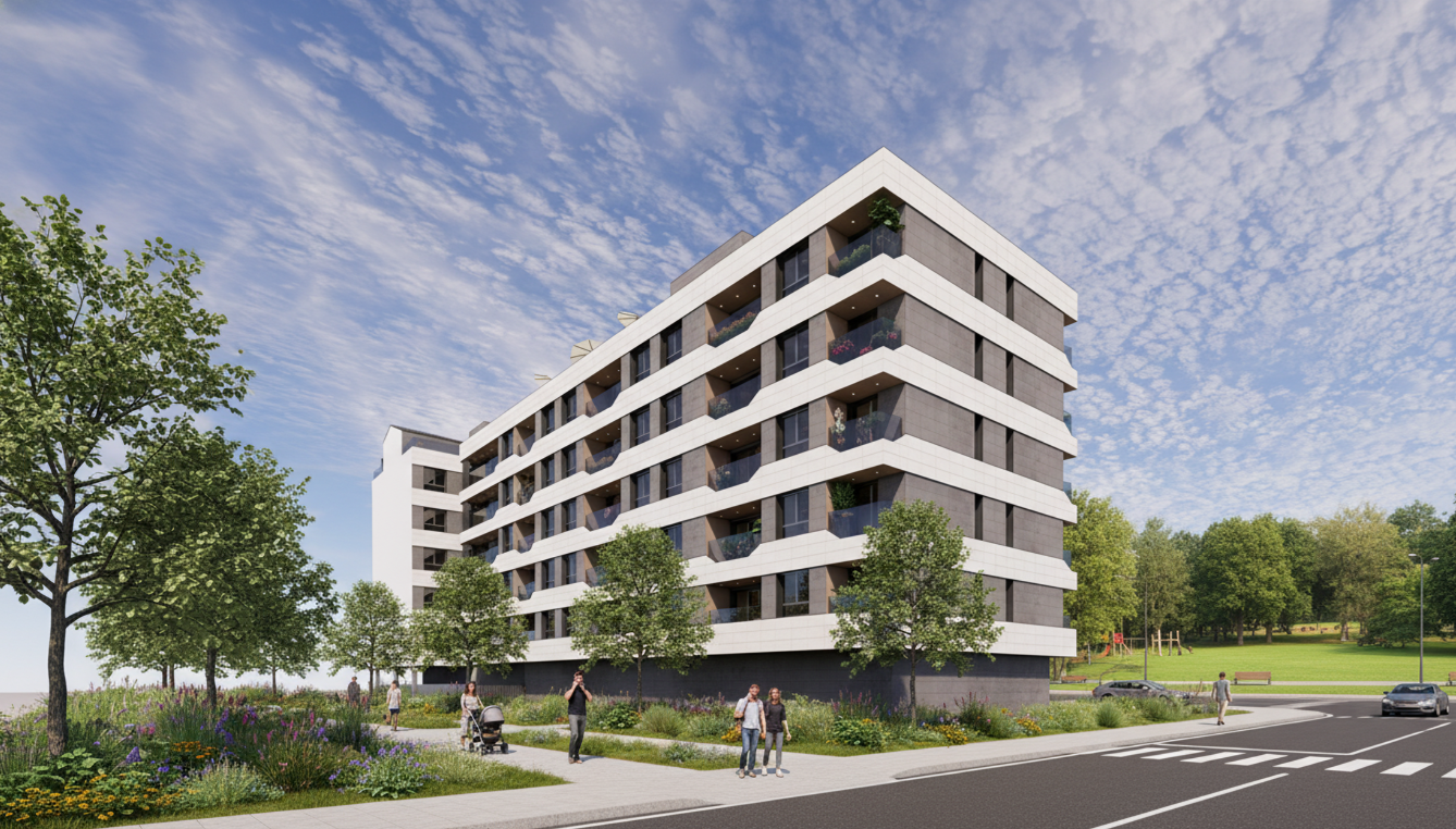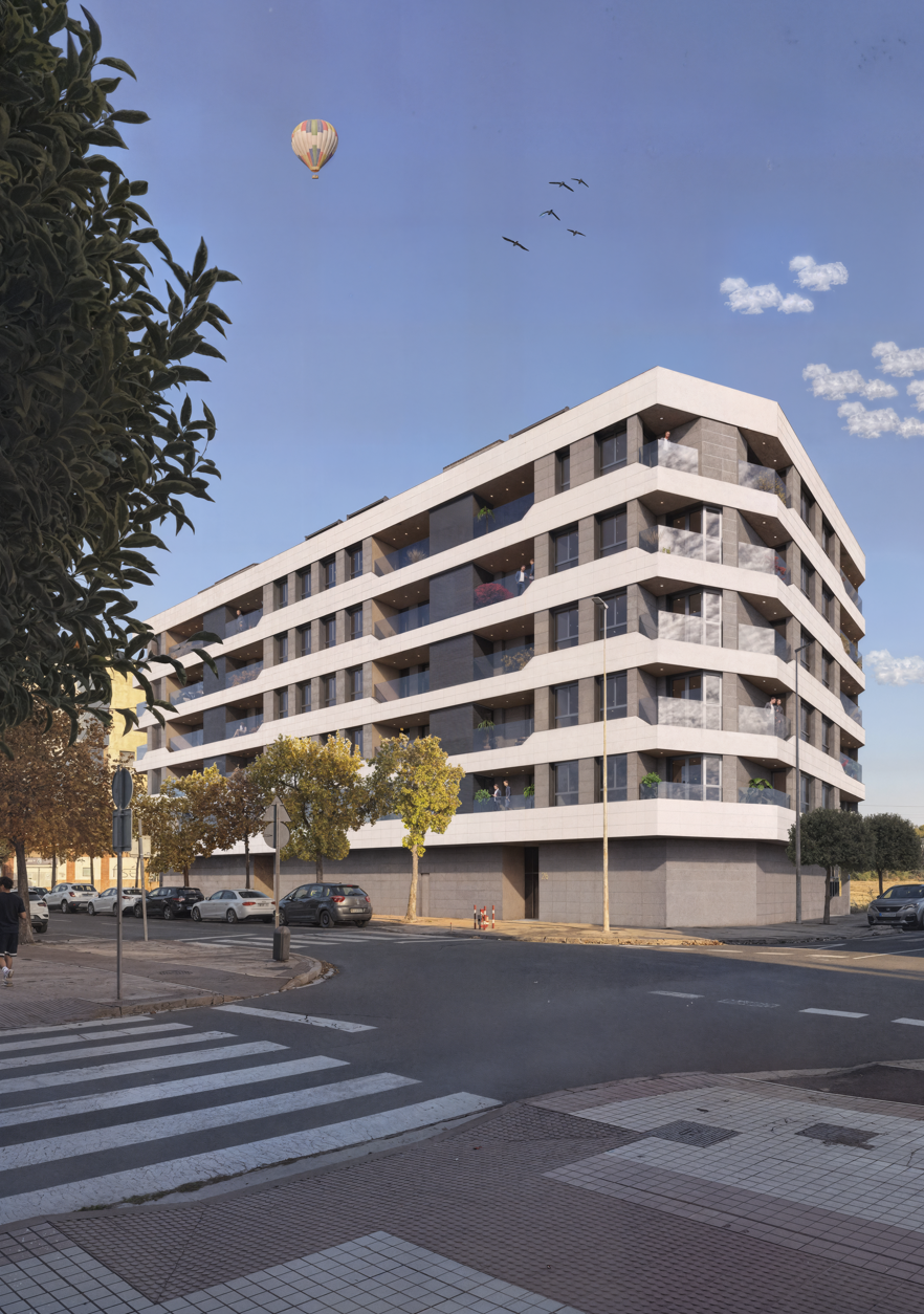45 viviendas en bloque (baja+5) distribuidas en 2, 3 y 4 dormitorios con garaje incluido en planta sótano -1º Y -2º con trasteros en planta baja y varios dúplex uniendo la 5º planta con la bajocubierta con amplias terrazas. En planta bajocubierta también cuenta con una terraza común para la comunidad de vecinos. Certificación energética «A».