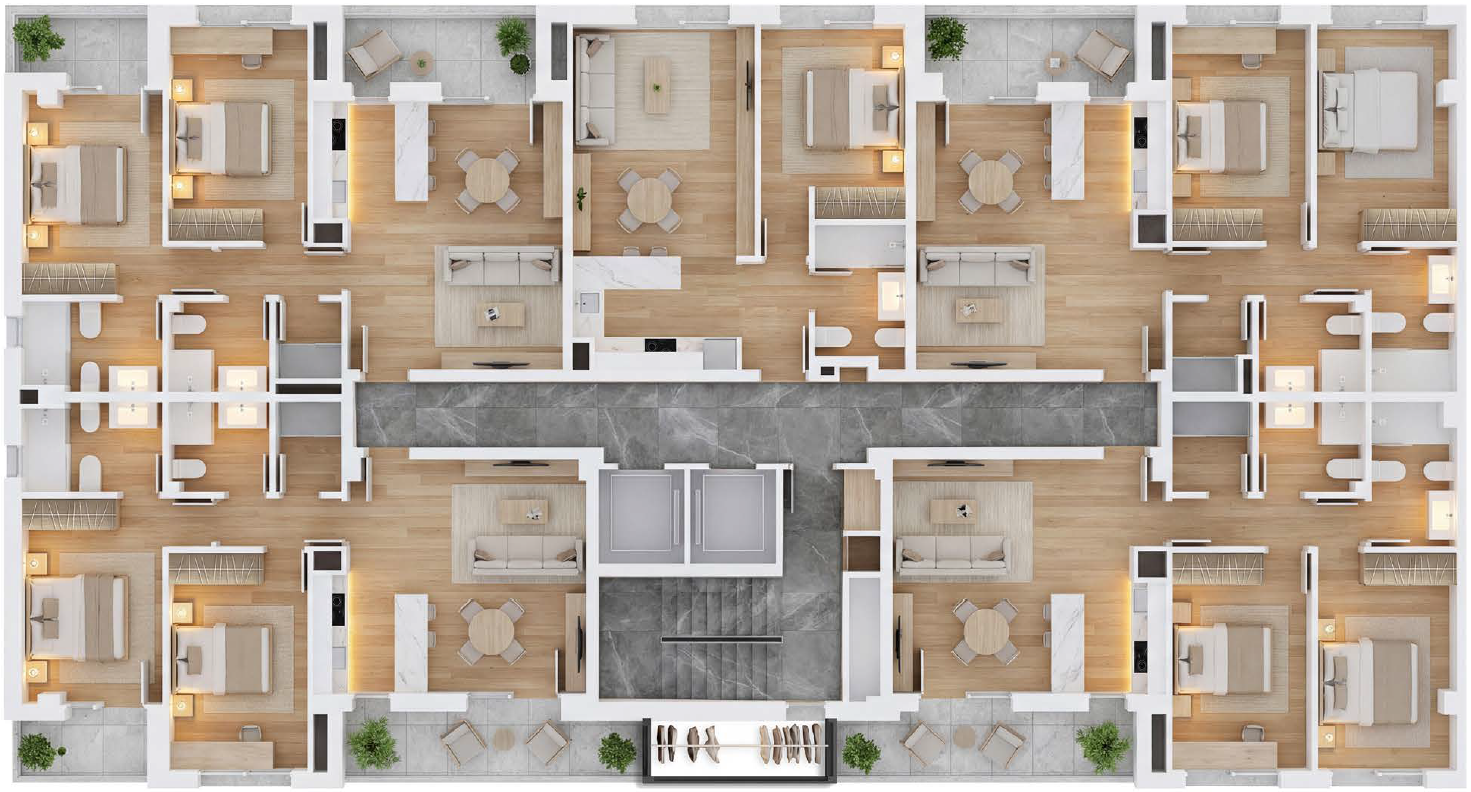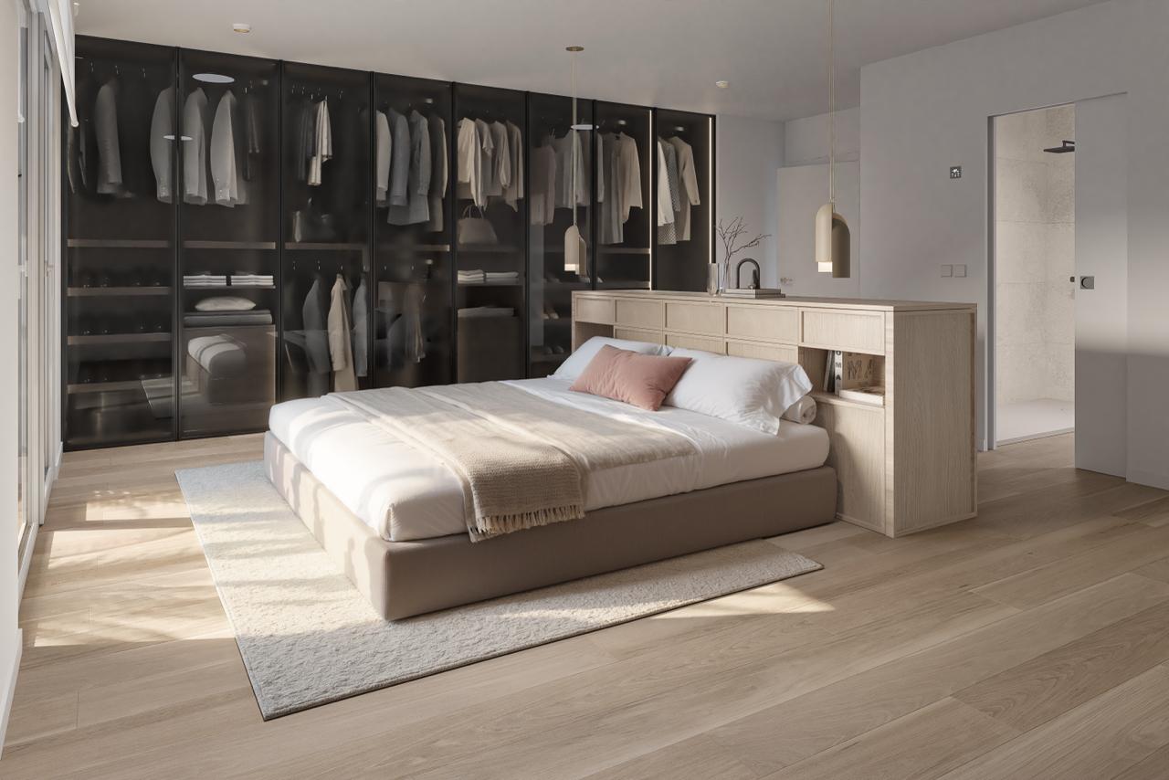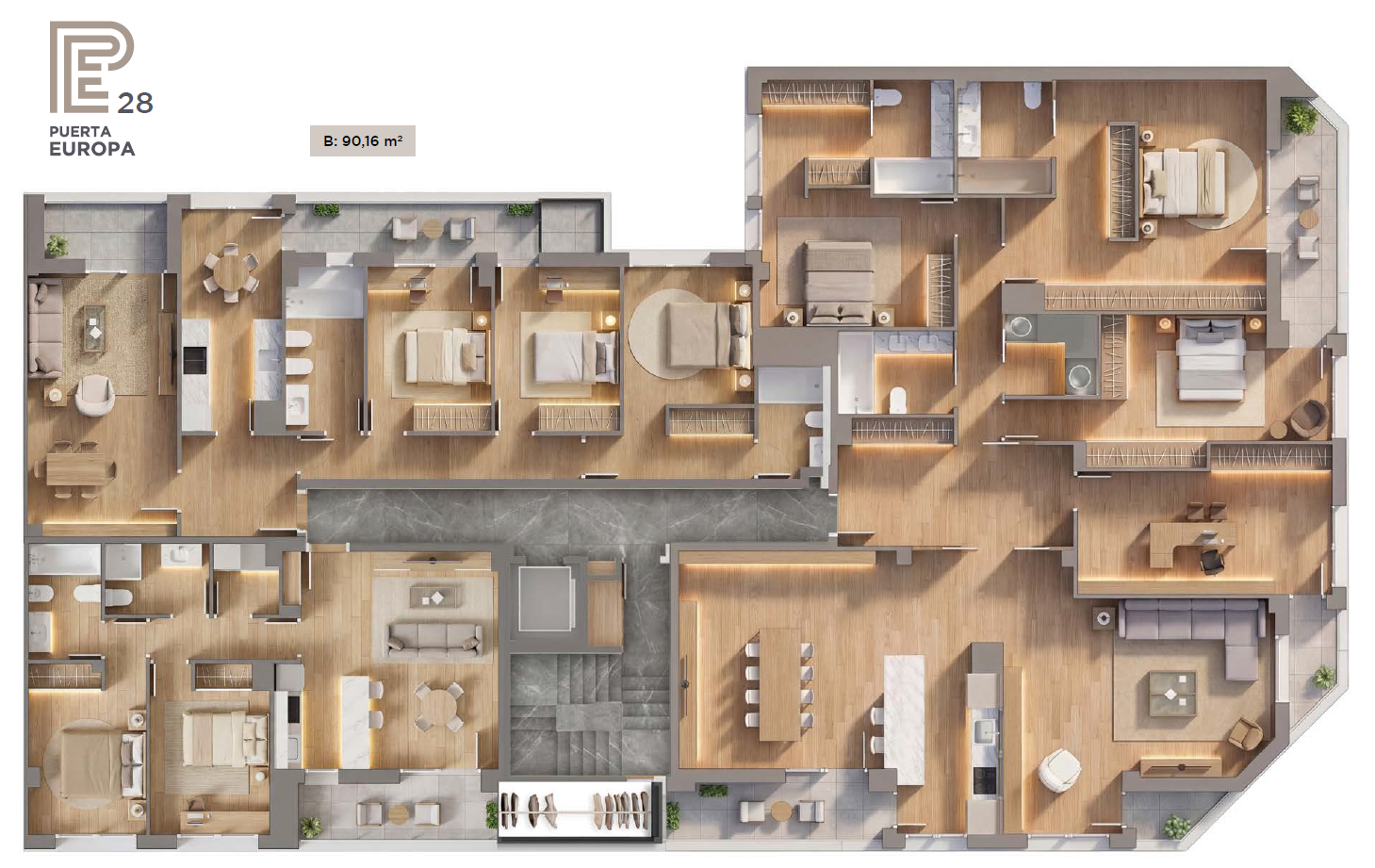 45 viviendas en bloque (baja+5) distribuidas en 2, 3 y 4 dormitorios con garaje incluido en planta sótano -1º Y -2º con trasteros en planta baja y varios dúplex uniendo la 5º planta con la bajocubierta con amplias terrazas. En planta bajocubierta también cuenta con una terraza común para la comunidad de vecinos. Certificación energética «A».