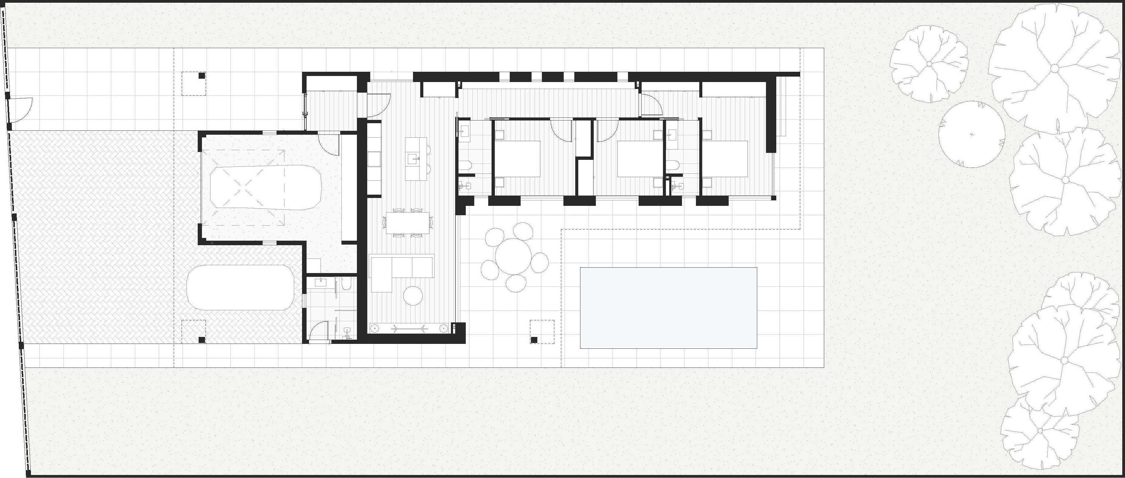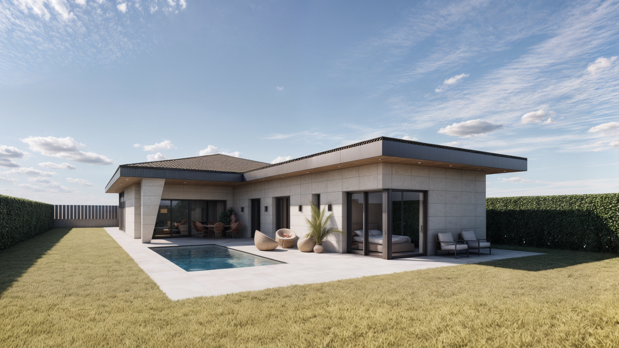 Vivienda unifamiliar de 150m² útiles en parcela de 950m² distribuida en una sola planta. Consta de 3 dormitorios, 2 baños, cocina/salón/comedor con acceso directo al jardin. Garaje cubierto en la parte frontal de la casa. Piscina en zona ajardinada privada.